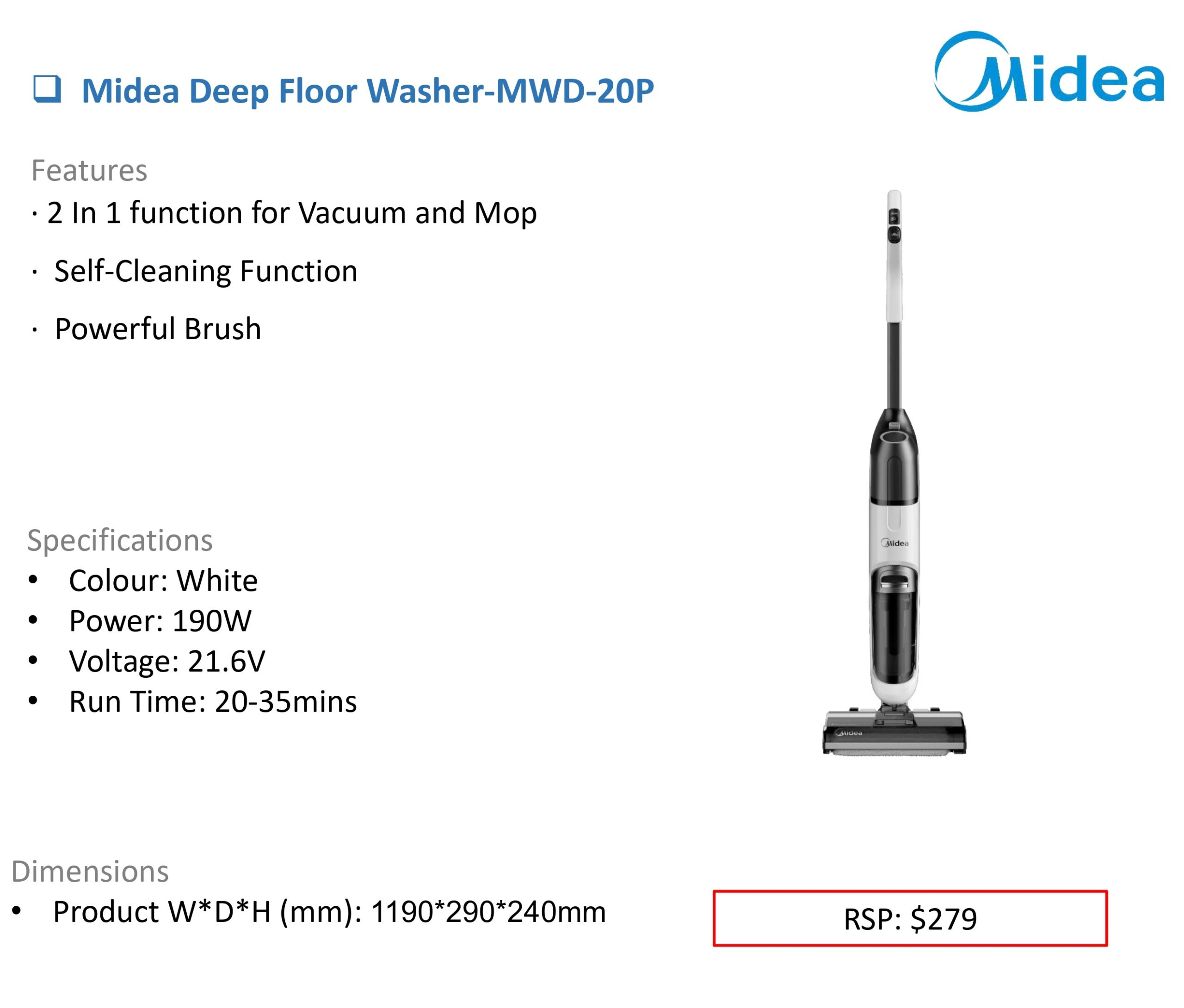 Specifications • Colour: White • Power: 190W • Voltage: 21.6V • Run Time: 20-35mins