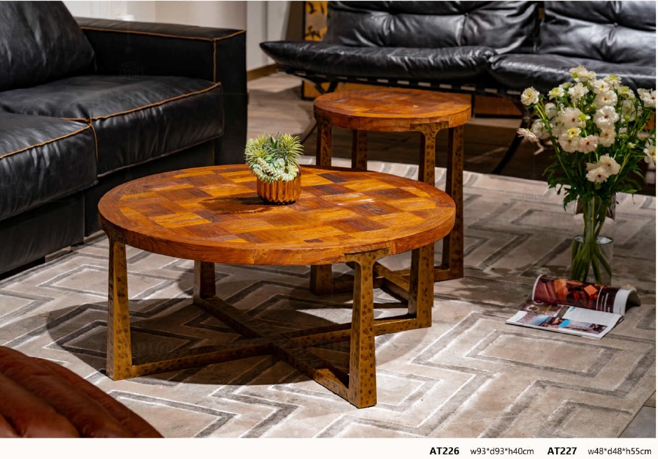 This handsome table collection is a perfect blend of modern design and rustic, natural materials. Each piece features a beautiful, round tabletop crafted from Elm wood, showcasing its rich and distinctive grain. The warm wood is supported by a hand-forged, solid iron frame, providing an industrial-chic contrast and exceptional durability.